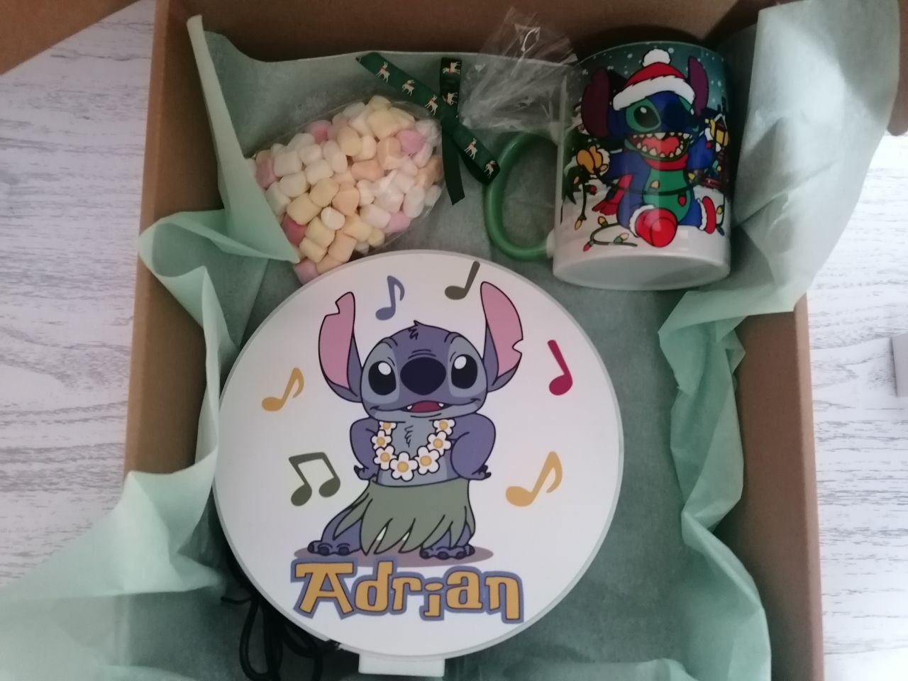 -Taza con imagen Stitch, Bolsa mini nubes con lazo al azar.