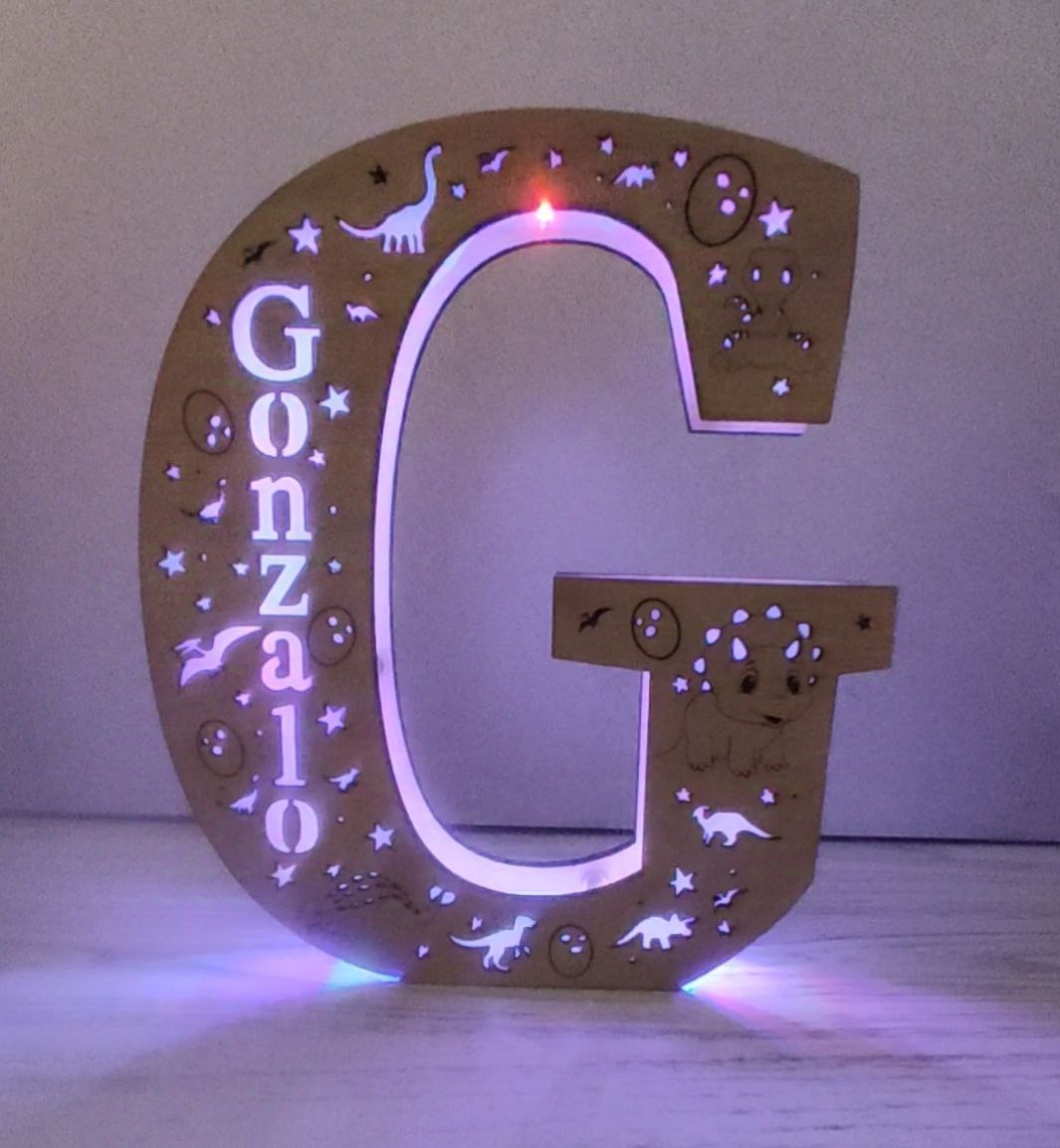 Lámpara Inicial con Dinosaurios personalizada en madera montada a mano por Merakea, España.